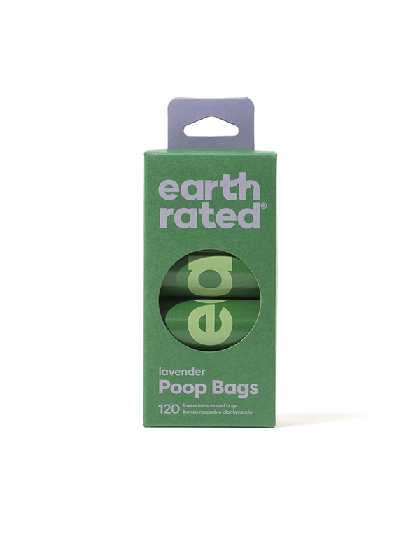 Earth Rated Poop Bags' plantebaserede, komposterbare affaldsposer er lavet af grøntsager. Som en miljøvenlig bonus er emballagen og kernerne også lavet af genbrugsmaterialer for at reducere deres miljøpåvirkning.