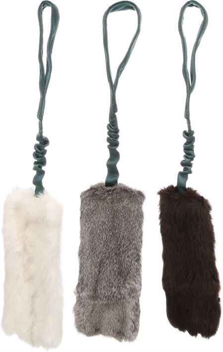 Legetøjet er fremstillet med ægte kaninpels, som gør det ekstra attraktivt for hunden, og kombineret med en snor med kraftig elastik (bungee), der sikrer en mere skånsom leg for både hund og fører.