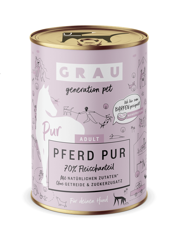 GRAU Pferd Pur er et monoprotein vådfoder af høj kvalitet, fremstillet udelukkende af hestekød. Det gør foderet særligt velegnet til hunde med allergier, intolerancer eller sart fordøjelse.